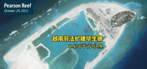 根据AMTI CSIS发布的数据,此番越南填出的最大岛屿在毕生礁,截止2022年10月24日,毕生礁面积已扩大到0.476平方公里,面积远超越南经营了几十年的南威岛,南威岛作为越南侵占我南沙岛礁的军事指挥中心,多次扩建后面积为0.388平方公里。