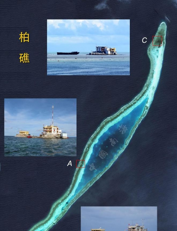 柏礁潟湖面积16.9平方公里,礁坪面积49.5平方公里,为南沙礁坪最大的环礁,作为比较,我国驻守的渚碧岛礁坪面积只有5平方公里,仅相当于柏礁的十分之一。