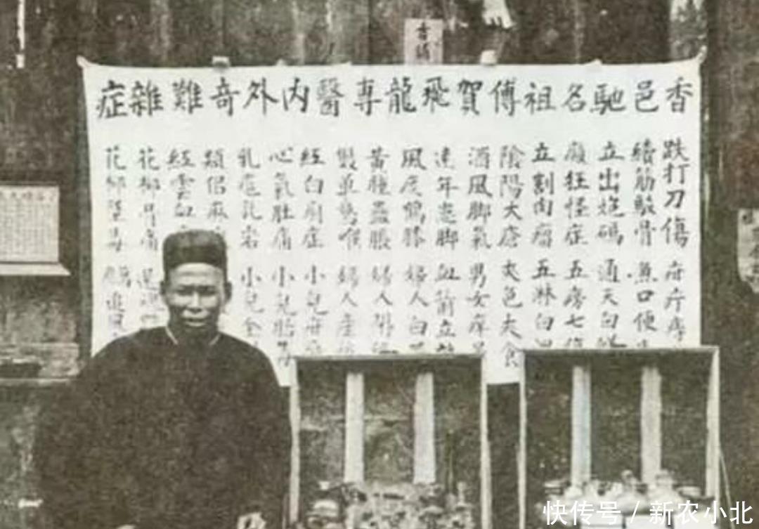 清末老照片,在外摆摊的中医男子,身后的条幅上写满了疑难杂症,对他来说都是药到病除,不过虚假成分更多一点吧!