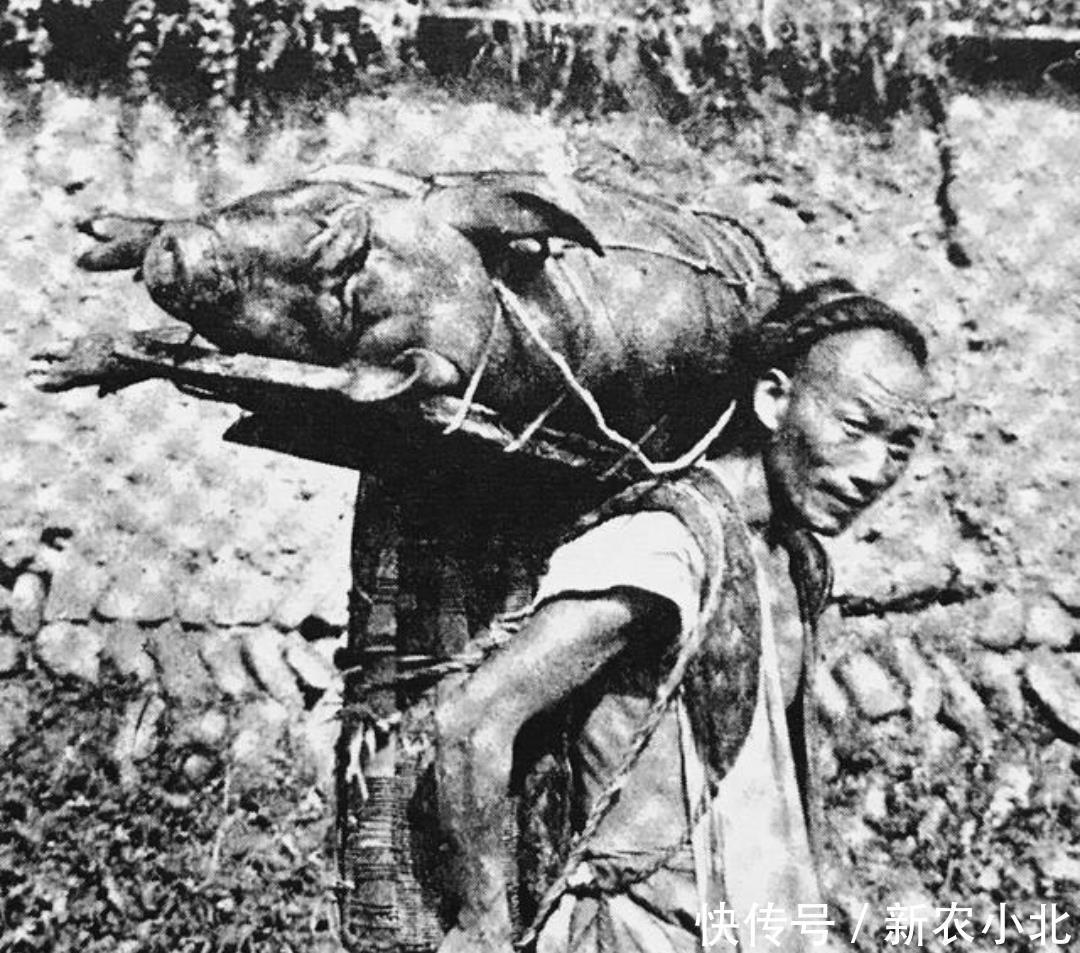 清末老照片,一位男子竟然背着一头猪去集市。那时候喂一头猪都两三年,哪有饲料,猪长得很慢。