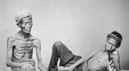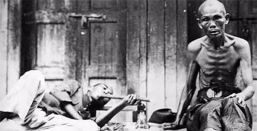 在清末流传下来的鸦片吸食者照片中,我们也能看到这些成瘾者的状态,确实和俞蛟的描述差不太多。吸食久者骨瘦如柴,肋骨根根分明,许多人端着烟袋往床榻上一歪,神色麻木又颓废,丝毫没有生气和朝气。