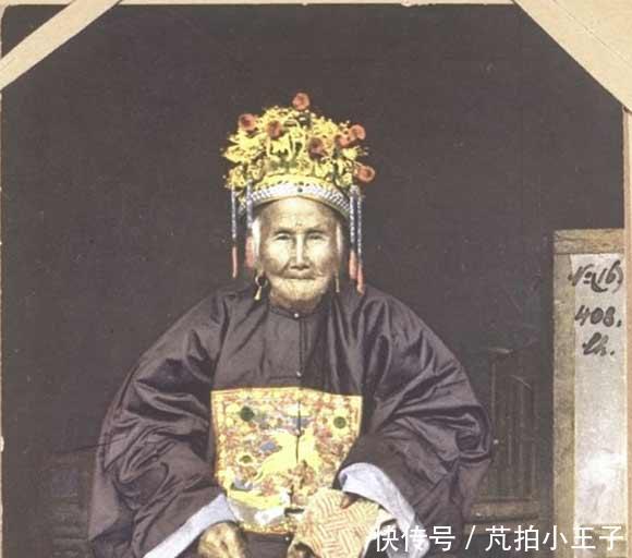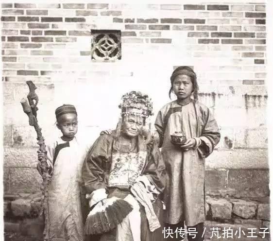 这是一位非常年迈的清末诰命夫人,身边的两位孩童是她的子孙,一个给她拿着拐杖,一个给她端茶。