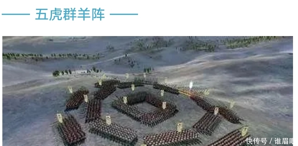 五虎群羊阵是主攻敌方心理阵线,在布阵上按照5字的希腊写法排列,却又与象征胜利的V字同型,未战就已在气势上占据绝对优势。