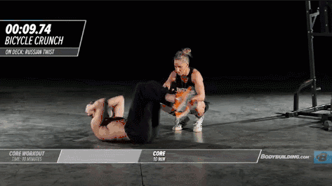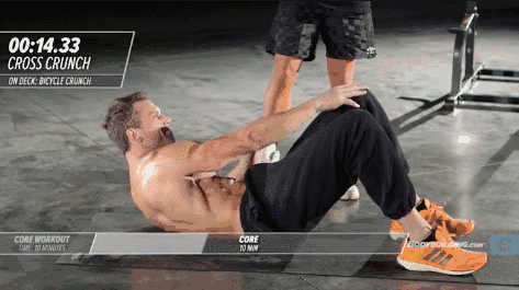 动作要领:仰卧,双腿抬离地面,双膝弯曲,双手掌心放于耳后。将左腿抬向腹部的同时,抬起上半身,调动腹部肌肉的力量把身体向上拉;随着身体位置的升起,身体稍微向右侧扭转,用左肘去贴近右膝。然后换腿做同样动作。