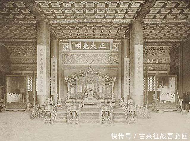 照片中,皇宫侍卫站在乾清宫前。乾清宫作为内廷的正殿。明清时期,16位皇帝将其作为寝室,与昆宁宫正好成了一阴一阳。乾清宫正殿宝座上方,有顺治亲笔题写的"正大光明"匾额。