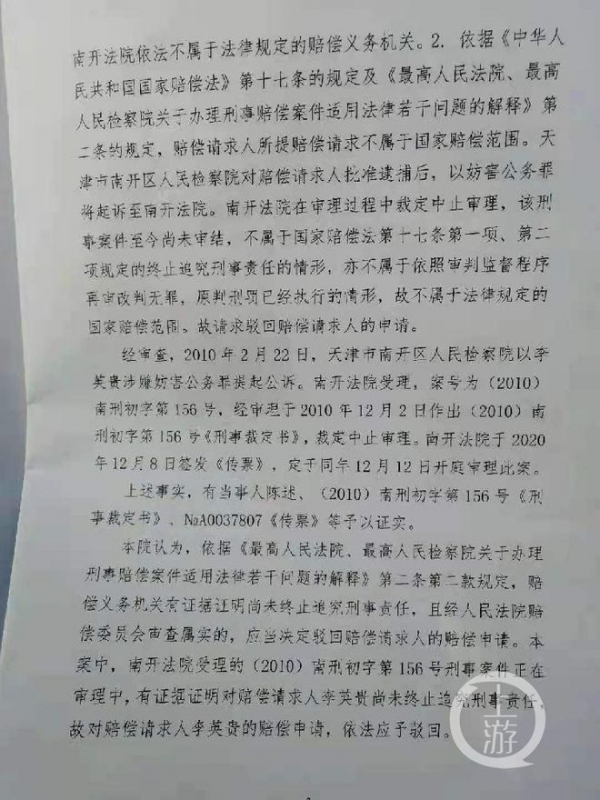 在开庭前一天的12月11日,红桥区法院作出国家赔偿决定书,该决定书显示,有证据证明李英贵尚未终止追究刑事责任,驳回其赔偿申请。也在这一天,李英贵接到法院电话称,开庭取消,等候通知。