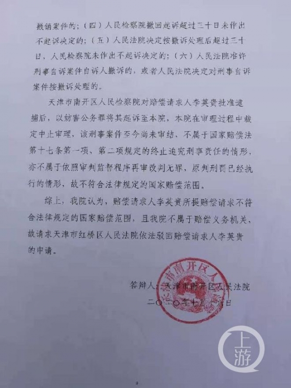 8月26日,红桥区人民法院对李英贵国家赔偿案进行了开庭询问。南开区法院在答辩状中称,李英贵所提赔偿请求不符合法律规定的国家赔偿范围,且南开区法院不属于赔偿义务机关,请求红桥区法院驳回李英贵的申请。