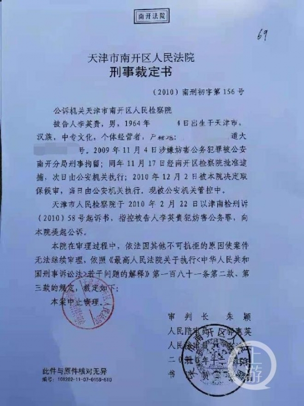 ▲2010年12月,南开区法院作出刑事裁定:“因其他不可抗拒的原因使案件无法继续审理”。图片来源/受访者供图