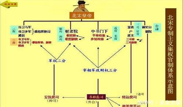 宋朝建立以来,为了加强皇权,宋朝历代皇帝不断对相权进行分割,逐步形成了军、财、民的"三权分立",使宋朝枢密使与宰相同掌大权。同时,宋朝又设立相关的副职对权力进行相互制衡,使官员之间形成了"扯皮",也削弱了权力,但皇帝的权力得到进一步巩固。