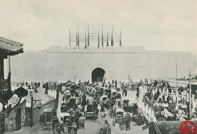1900年,前门箭楼在战乱中遭受炮火侵袭,城楼被毁,只剩下了城台。等到慈禧太后回銮时,来不及新建城楼,大臣们在城台上临时搭建了彩牌楼,聊饰观瞻。