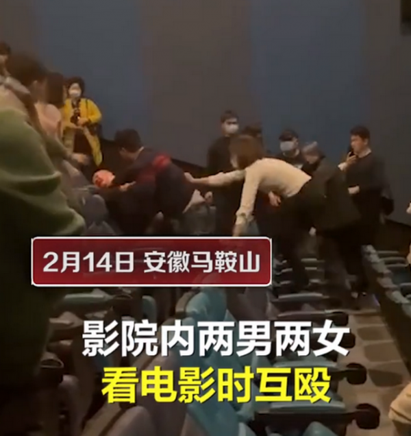 2月14日, 安徽马鞍山一影院内两男两女看电影时互殴。据现场视频显示,影厅内正播放电影时,两名女子突然互相推搡。