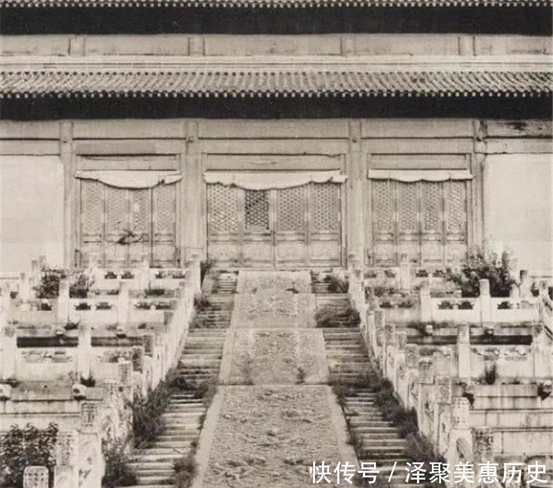 看着这些百年前的紫禁城,在乾隆盛世的时候肯定不是这个样子,照片中肯定会有很多宫女太监把手,里面肯定也会擦得干干净净,一定不会像照片中的这样,满是尘土!台阶上的杂草很多,应该是很长时间没有人走动了,中间的龙浮雕看上去非常的精美。在清朝,只有皇帝在龙浮雕上走路,其他人都走台阶!