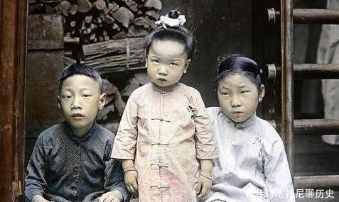 晚清罕见上色老照片:图为晚清的两个小女孩和一个小男孩。