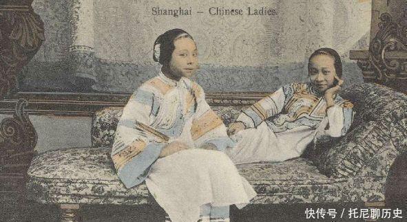 晚清罕见上色老照片:图为晚清大户人家的妻妾,躺在沙发上的女子颇有姿色、媚态毕露。