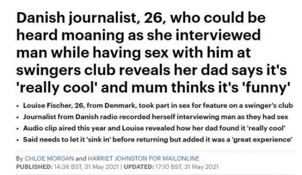 报道称,丹麦在疫情好转的情况下放宽了限制措施,一些性俱乐部也得以重新运营。作为报道活动的一部分,丹麦一名叫露易丝 · 费希尔 ( Louise Fischer ) 的女记者在今年早些时候对哥本哈根一家 " 换妻俱乐部 " 进行了专访。