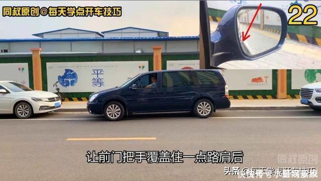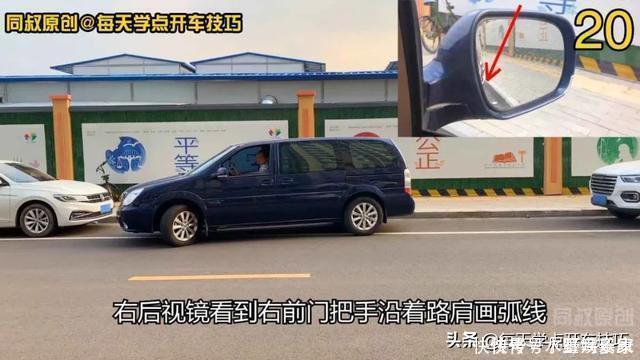 首先看看第一点,如何把握向左打方向的时机:一边向右打满方向一边倒车,目视右侧后视镜,注意观察右前门把手与路肩的对齐关系,