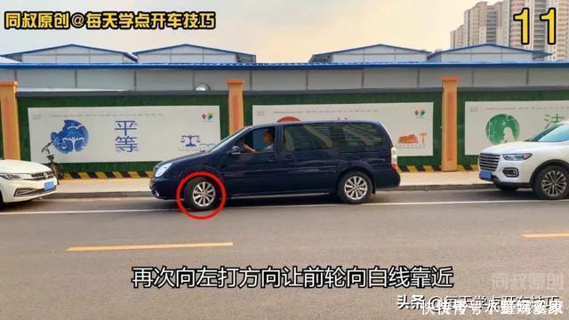 向右打方向继续倒车入位。随着方向往右打,左后轮也逐渐向白线靠近,