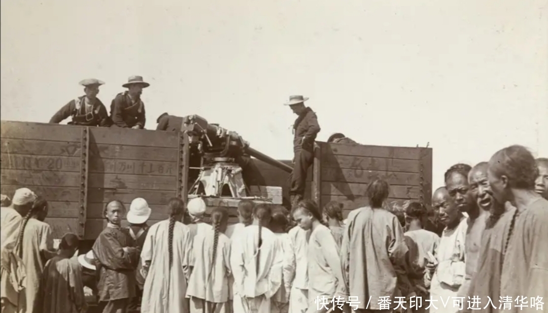 八国联军占领天津后,又用火车运送大炮攻打北京城,这就是当时天津火车站上的一幕。拖着辫子的清朝百姓围观洋人运送武器,有人还提着鸟笼子,漠不关心。"国不知有民,民亦无国"的真实写照。