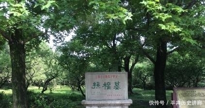 石碑上写着孙权墓,看不见真正的陵墓在哪里。在三国堂堂割据一方的东吴大帝,墓地成树林显凄凉,真是叫人感慨万千。
