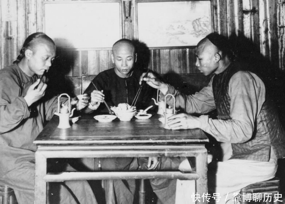这是晚清1910年一户客栈里人们用餐的老照片,照片中三位年轻的晚清男子斯文的端坐在桌前,虽然他们衣着还算得体,只是脚上无鞋亦是令人心酸。古人多是从事劳动重活,长年累月的重活非常伤鞋。为了节省买鞋的钱,很多人都是光脚出门干活。清朝百姓生活如此悲惨贫穷,如此思来的确令人心酸落泪。