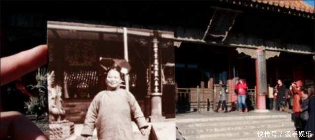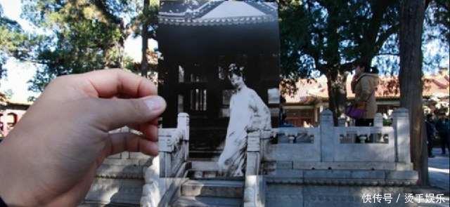 《紫禁城》杂志此前曾发不过一组手持老照片穿越故宫今昔的组图。图为1923年,末代皇后婉容在御花园禊赏亭。