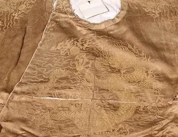 鲁荒王墓中有三件四团龙盘领袍,其中一件出土时就穿在朱檀身上,衣身长134厘米,两袖通长210、袖宽28.5、袖口宽14厘米