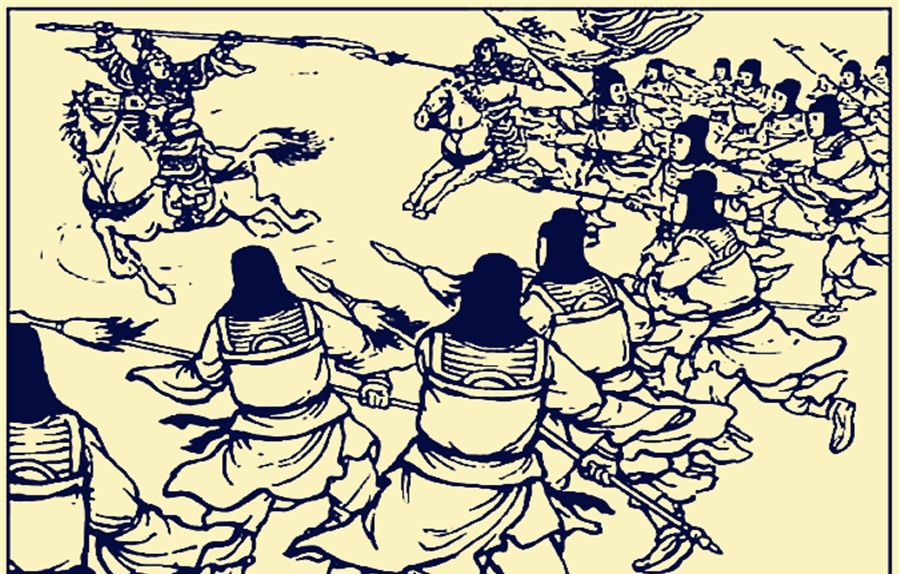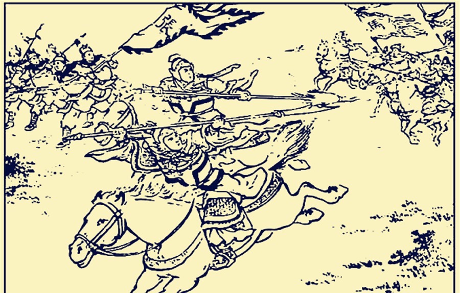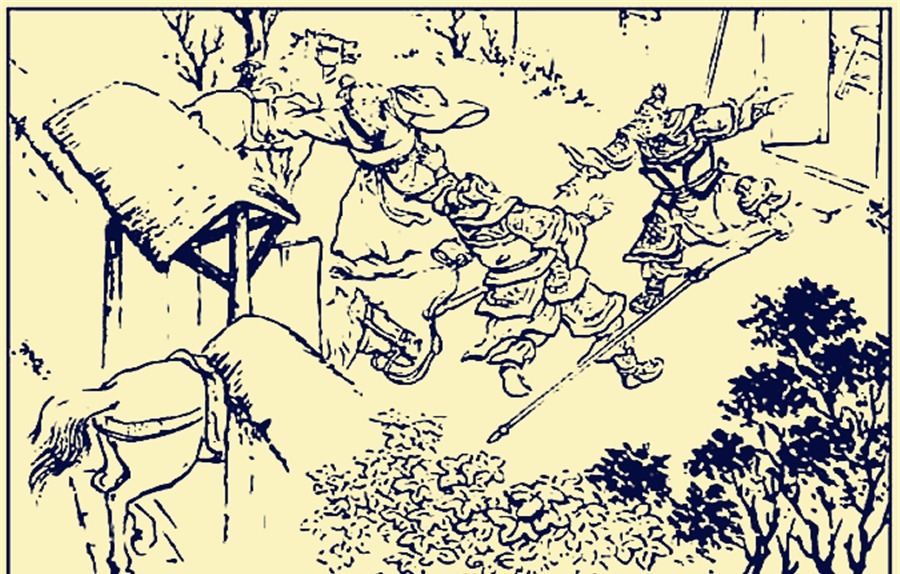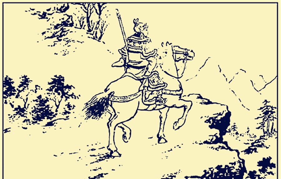 兴急走到前面,尽力纵马加鞭,正遇断涧,只得回马来战越吉。兴终是胆寒,抵敌不住,望涧中而逃;被越吉赶到,一铁锤打来,兴急闪过,正中马胯。那马望涧中便倒,兴落于水中。(《三国演义》)