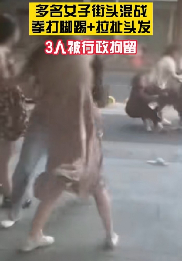 根据监控画面显示:七八名女子在街头上演混战,拳打脚踢撕扯头发,甚至还脱下高跟鞋殴打对方。