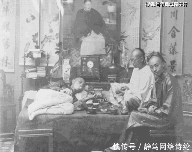 清末,曾经骁勇善战的八旗子弟已经彻底腐化,提笼遛鸟抽鸦片,家资败光,有的连祖宗兵器都变卖。图中的八旗后裔在鸦片中醉生梦死,而祖宗的遗像就挂在墙上,十足的败家子。