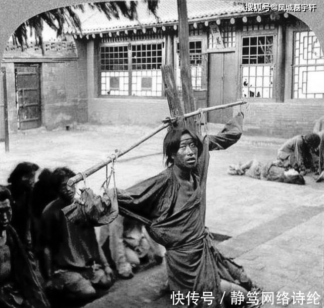 一男子在接受枷刑。犯人半跪着,被一根木棒捆住双手挂在木桩上,一脸的绝望。身后还有犯人在等着受刑。而远处有犯人已经倒地而亡。