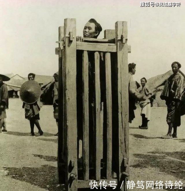 站笼里的犯人,在阳光下暴晒,过往的行人边走边看,杀一儆百。