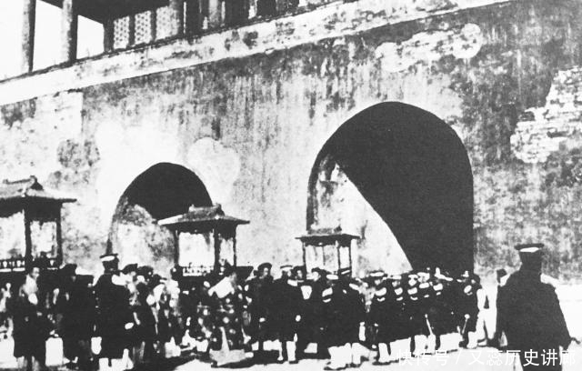 溥仪和婉容大婚时,神武门前民国派出的维护治安的人员。根据溥仪退位优待条件,民国负责紫禁城外围治安。