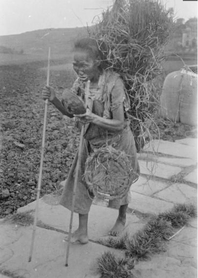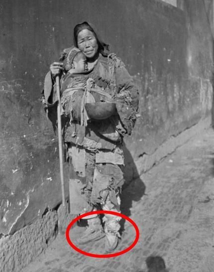 图片中的老奶奶明显是穷到没有鞋子穿,背后还背着一捆柴草。应该是乞讨路上顺便捡来的干柴,以便生火所需。