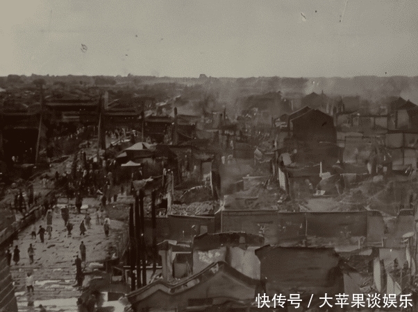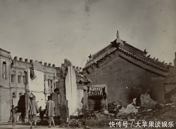 (图为被战火摧毁的北京城民居。) 由于八国联军入侵,此时被战火肆掠过后的街道,大量北京城内的百姓出逃,街上变得人烟稀少起来。