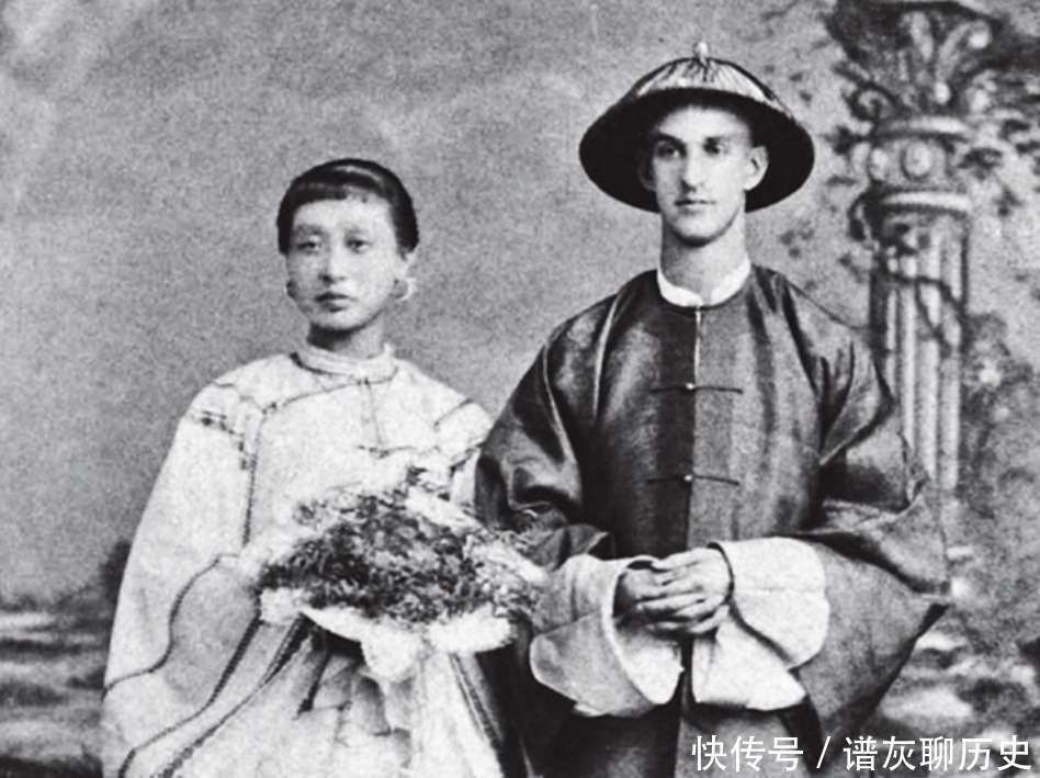 图为晚清末年一位上海女子黄素娥和美国丈夫卜肪济成亲时候的老照片,黄素娥自小受家庭环境影响,长大后不但习得了外语和西方文化,而且还认识了一位美国青年才俊卜肪济。不过大婚的时候,黄素娥还是穿着传统的婚嫁袄子与马面裙,其身旁的丈夫卜肪济则穿着清朝大臣的官服。