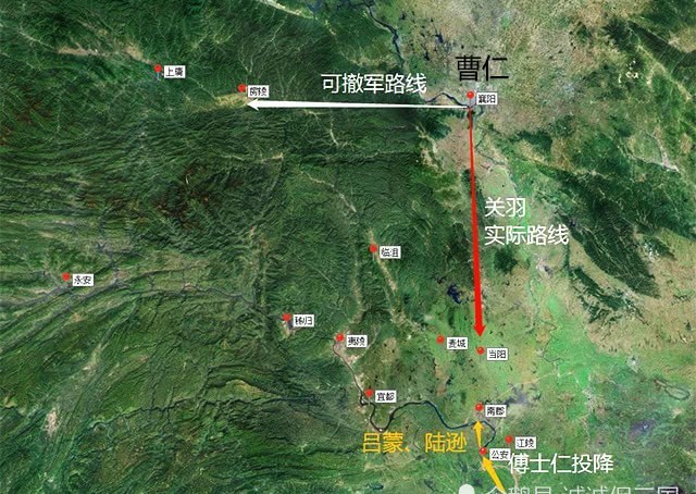 当南郡失守的消息,传到襄樊前线的关羽大营时,关羽下令撤军回防,曹仁奉曹操之令,没有追击。关羽在这个时候,可以选择向西撤退,那么可以很快到达刘封、孟达驻守的上庸、房陵。这样做自然就不会导致后来的兵败被杀害。