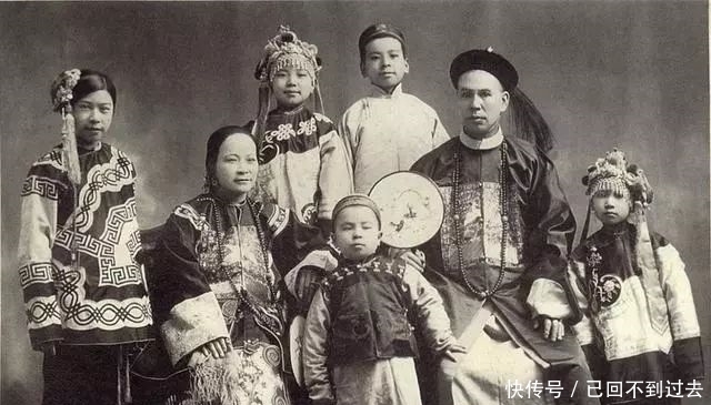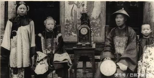 一位官员的全家福,小妾站在一旁。清朝虽然实行一夫一妻制,但对小妾的数量没有要求。当然,能纳妾的人,无一不是权贵阶层。