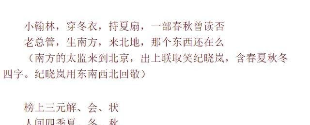 他嘲笑纪晓岚,用南方口音说:"小翰林,穿冬衣,捧夏扇,一部春秋曾谈否?"