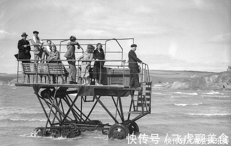 【图7】1935年,由卡特彼勒公司生产制造的24马力摆渡车,正在将一群度假者从英国德文郡的比格伯里(Bigbury)的海滩上,运送到四分之一英里外的伯格岛(Burgh Island)。在退潮的时候,人们徒步就可以走到岛上去,但是在涨潮的时候,就需要用到这个专门的运输车了。这种车没有驾驶室,没有顶棚,最适合欣赏大自然美丽的风景。