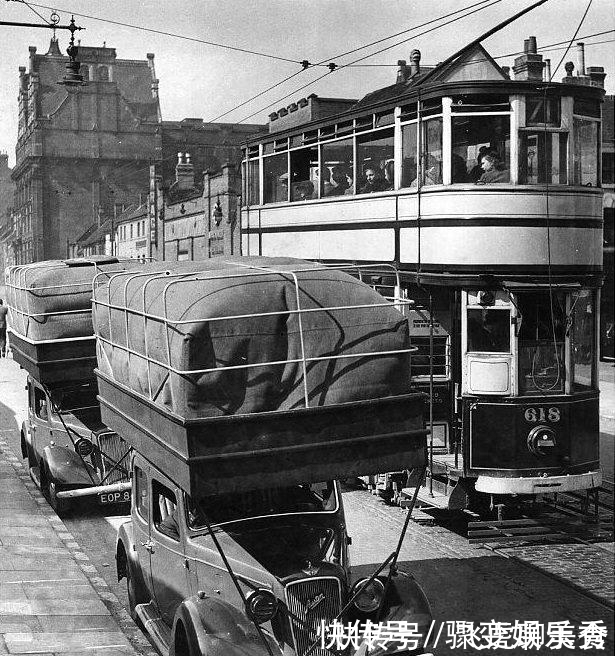 【图9】这是20世纪的英国伯明翰街头,中间道路上行驶的是双层有轨电车,这并不罕见。但是在左侧的两辆小汽车,可能许多人没见过。它们的车身上,都顶着两个大铁架子。上面放着一个大包,外面还有一个铁栅栏作为防护罩。难道这是它们运输的货物吗?告诉你吧,这其实是当时的出租车,而车顶上的大包里装的,则是一种未经压缩的燃气,它是一种把煤转化成焦炭的过程中产生的副产品。之所以使用这种气体,主要是为了应对汽油短缺,这一包气体可以使出租车续航15到20英里(24到32公里)。