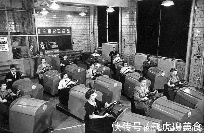 【图8】1953年3月,在美国纽约市的布鲁克林高中,学生们正各坐在一辆模拟小汽车里,来学习如何驾驶汽车。在他们的面前有一个大屏幕,上面会投射出模拟的交通状况。