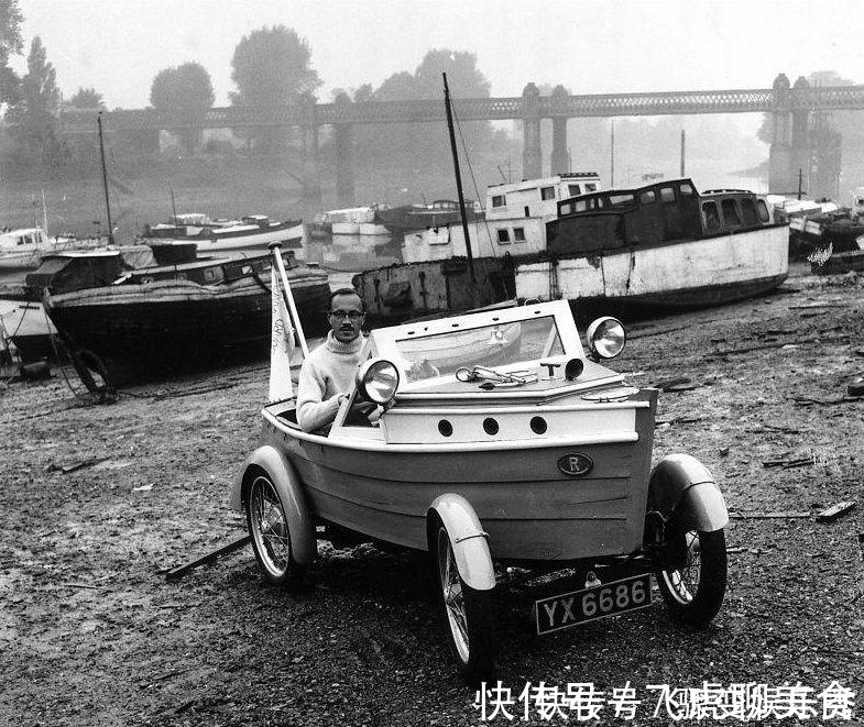 【图2】一辆两栖的莱利车(Amphibian Riley car)正穿行在英国的塞文河上。这种车的车身被安装在一个便携式气球装置上,所以能够漂浮在水面上,然后再通过后轮上浆片的转动来驱动车辆前行。