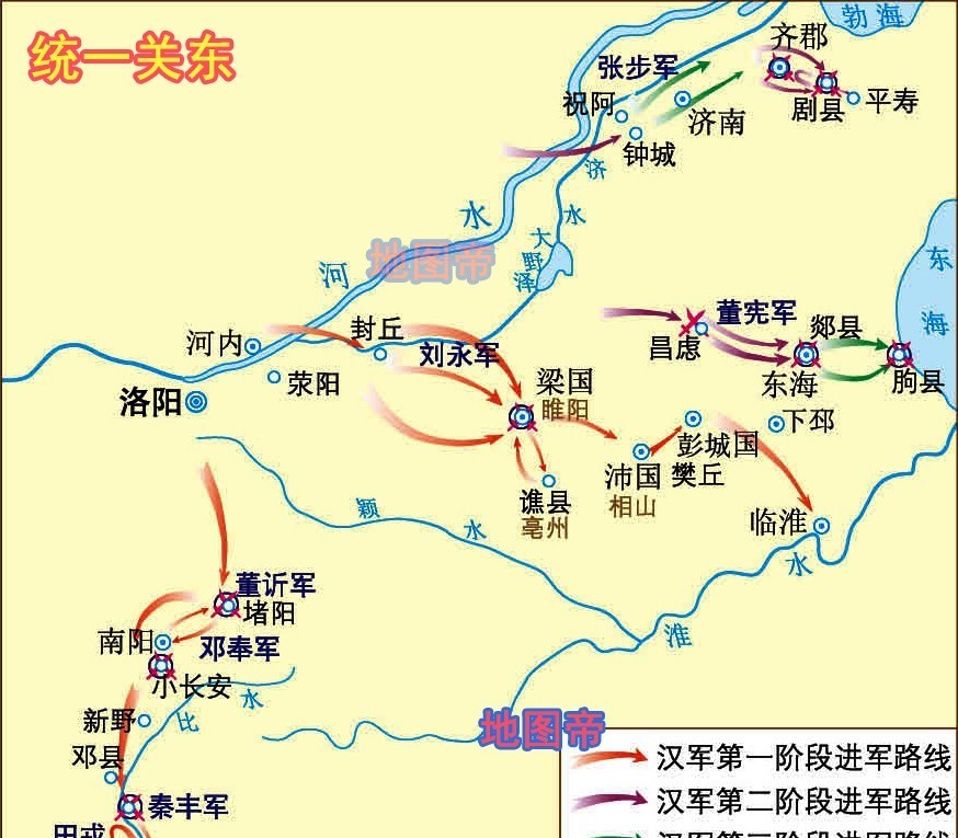 刘秀根据当时的形势,制定了先关东、后陇蜀,由近及远、各个击破的战略方针,先集中力量消灭威胁最大的关东割据势力。公元26年起,刘秀在四年内先后打败刘永、刘玄余部、董?、邓奉、秦丰、田戎、彭宠、董宪、张步等割据势力,统一了关东地区。