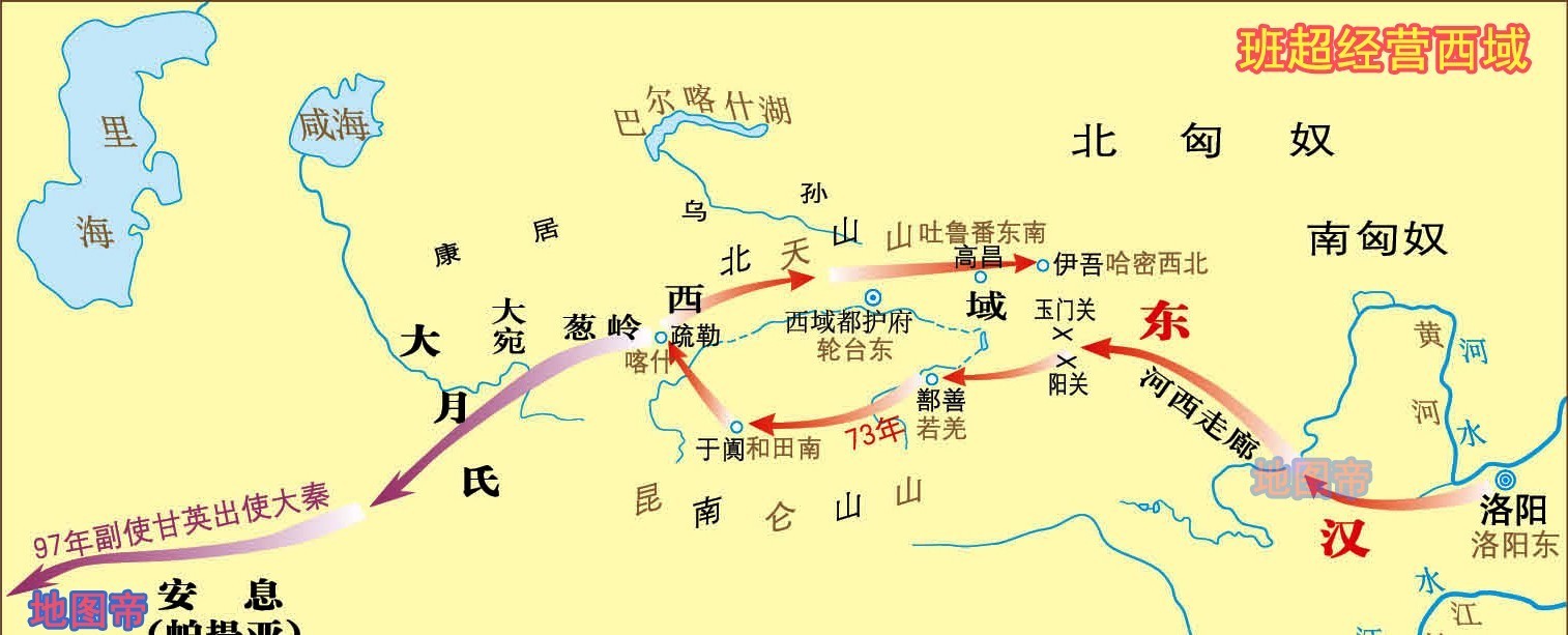 东汉在反击匈奴的同时,于公元73年派班超出西域,反击匈奴。班超经营西域二十余年,使得西域摆脱匈奴的控制,西域诸王重新归汉,东汉重设西域都护府,将西域纳于汉王朝统辖之下。班超还派甘英出使大秦(罗马帝国),虽未能抵达,但也加深了对中亚地区的了解。