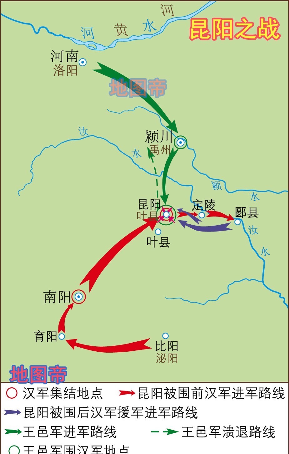 新朝灭亡后,刘秀兄长刘縯无故被更始帝所杀,强忍悲痛、隐忍负重的刘秀于公元25年同更始帝决裂,在河北鄗县(今河北省邢台市柏乡县)千秋亭称帝,建立东汉,以洛阳为都。而更始帝则屡被赤眉军击败,请降后获封长沙王,之后又被赤眉缢杀。刘秀前进路上的对手就剩下各地的割据势力。