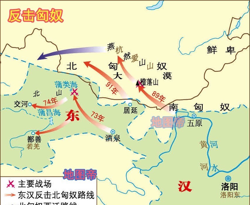 每逢中原乱世,北方的游牧势力总会趁势而起,袭扰中原。东汉初,曾被汉武帝痛击的北方匈奴再次崛起,东汉只能被动防御。公元48年,匈奴南北分裂,南匈奴归附东汉,而北匈奴则雄踞漠北。汉明帝时,国力得到恢复,在公元73年至91年的十余年间,数次派窦固、耿秉、耿宪等率军对被匈奴展开反击,打败匈奴呼衍王,使其不敢返回故地。