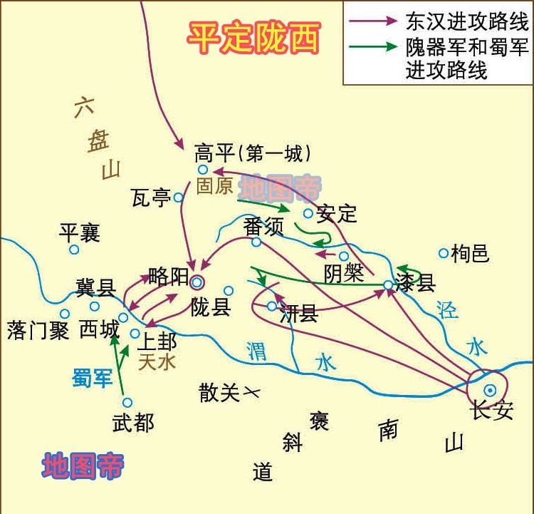 扫平关东地区以后,刘秀下一个对手是盘踞陇西地区的隗嚣。公元30年,刘秀派大将耿弇等人从陇西攻蜀,隗嚣派兵阻止,双方爆发持续数年的大战。公元33年,隗嚣病死后其子隗纯继位,不久投降,至此陇西被东汉平定。