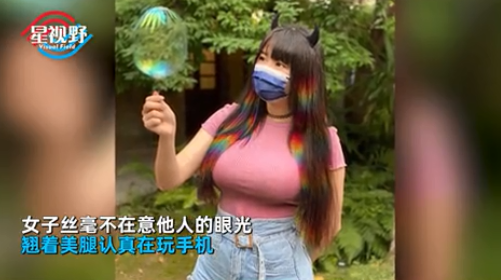 女子丝毫不在意他人的眼光,翘着美腿认真在玩手机