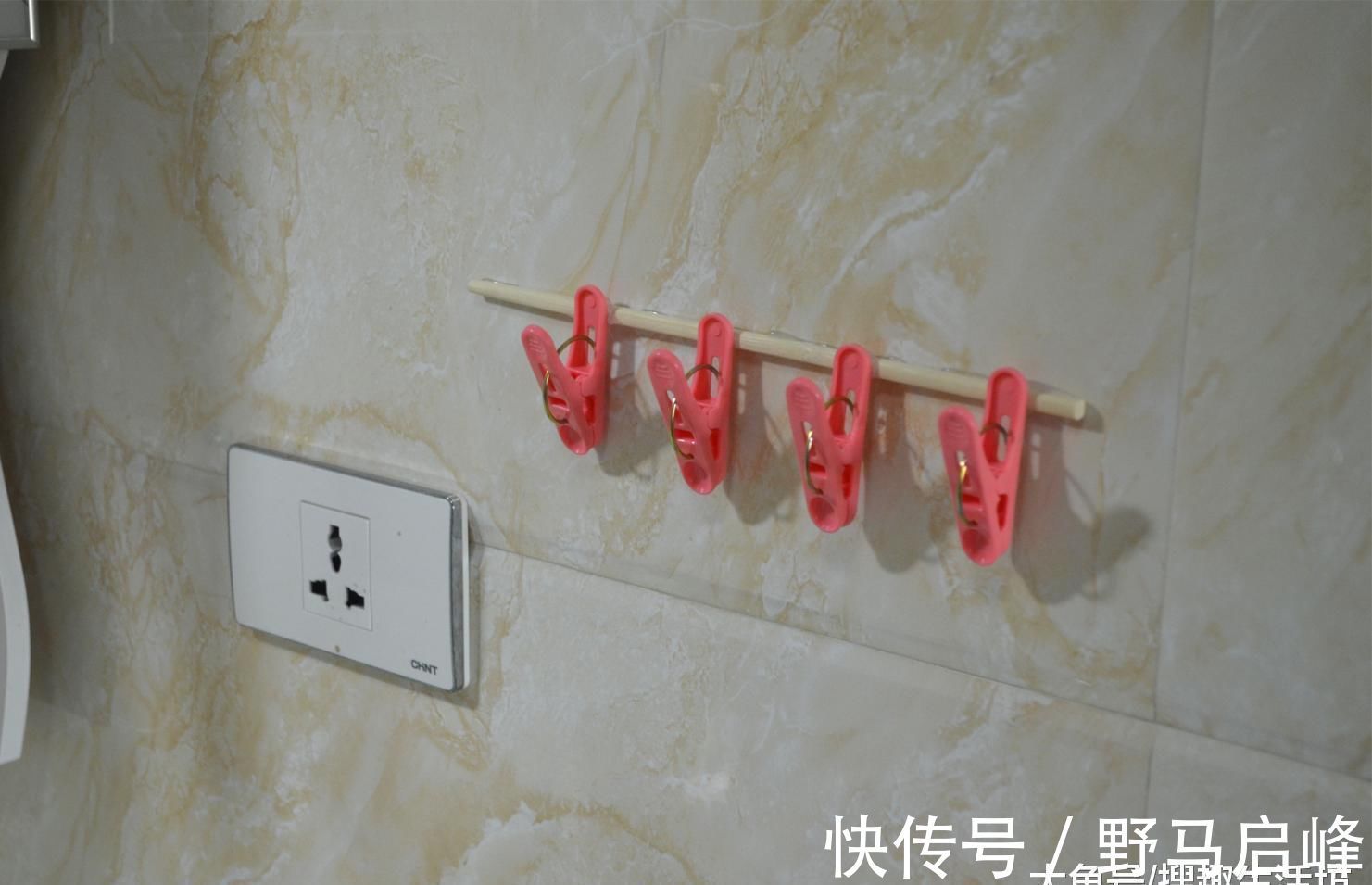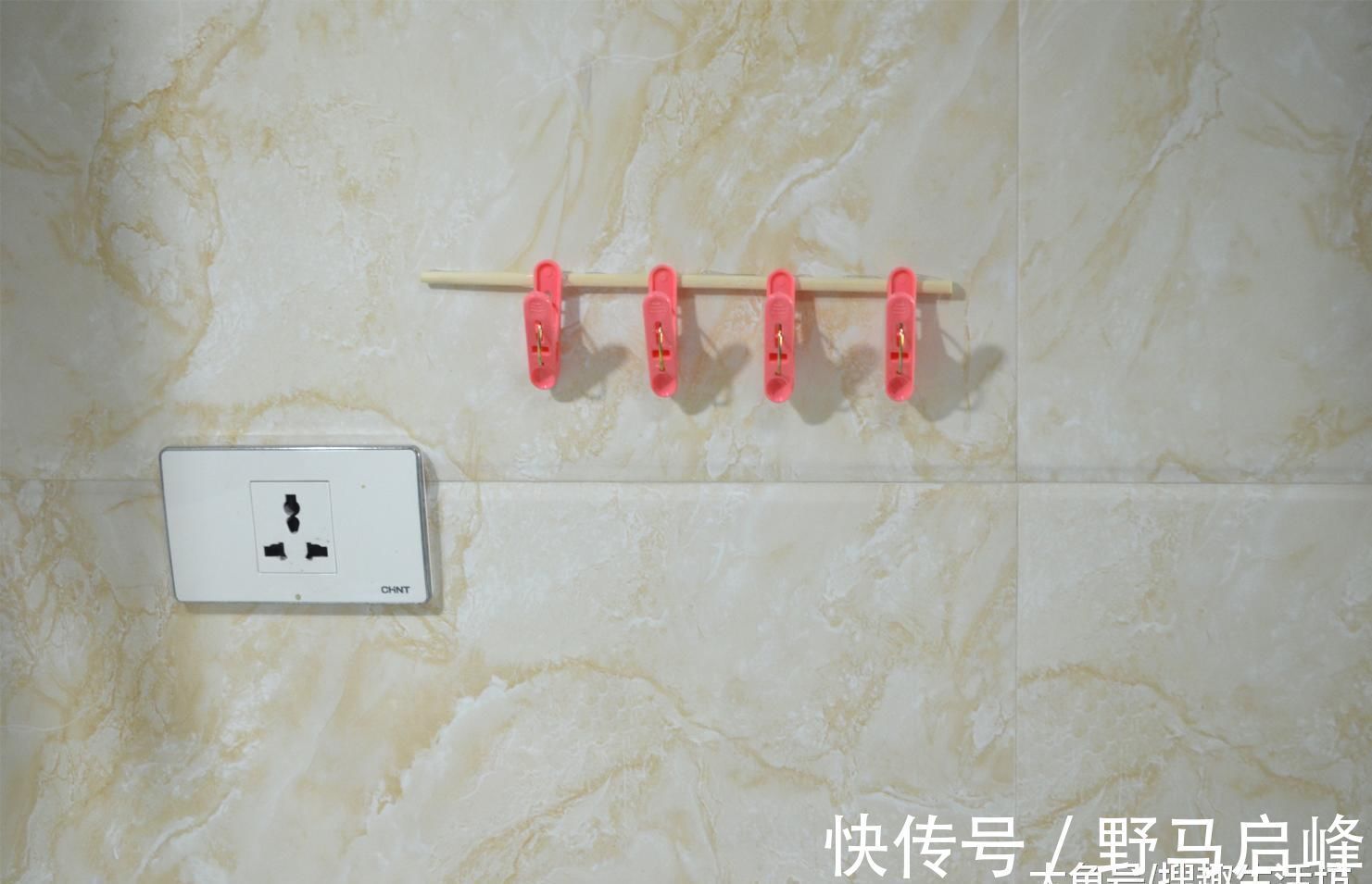 最后将筷子粘在卫生间的墙壁上即可。这样一个简单又实用的卫生间挂架就制作完成了。
