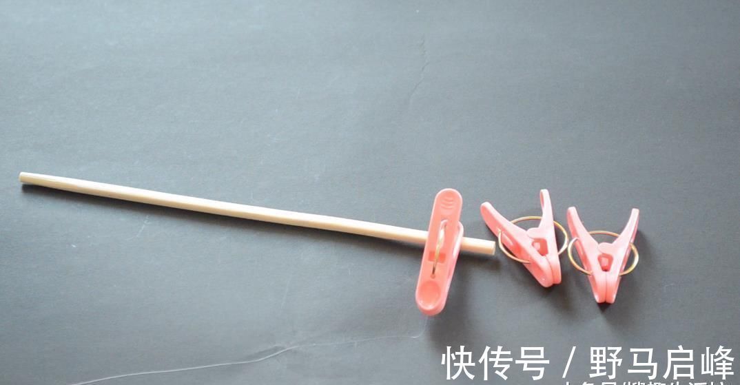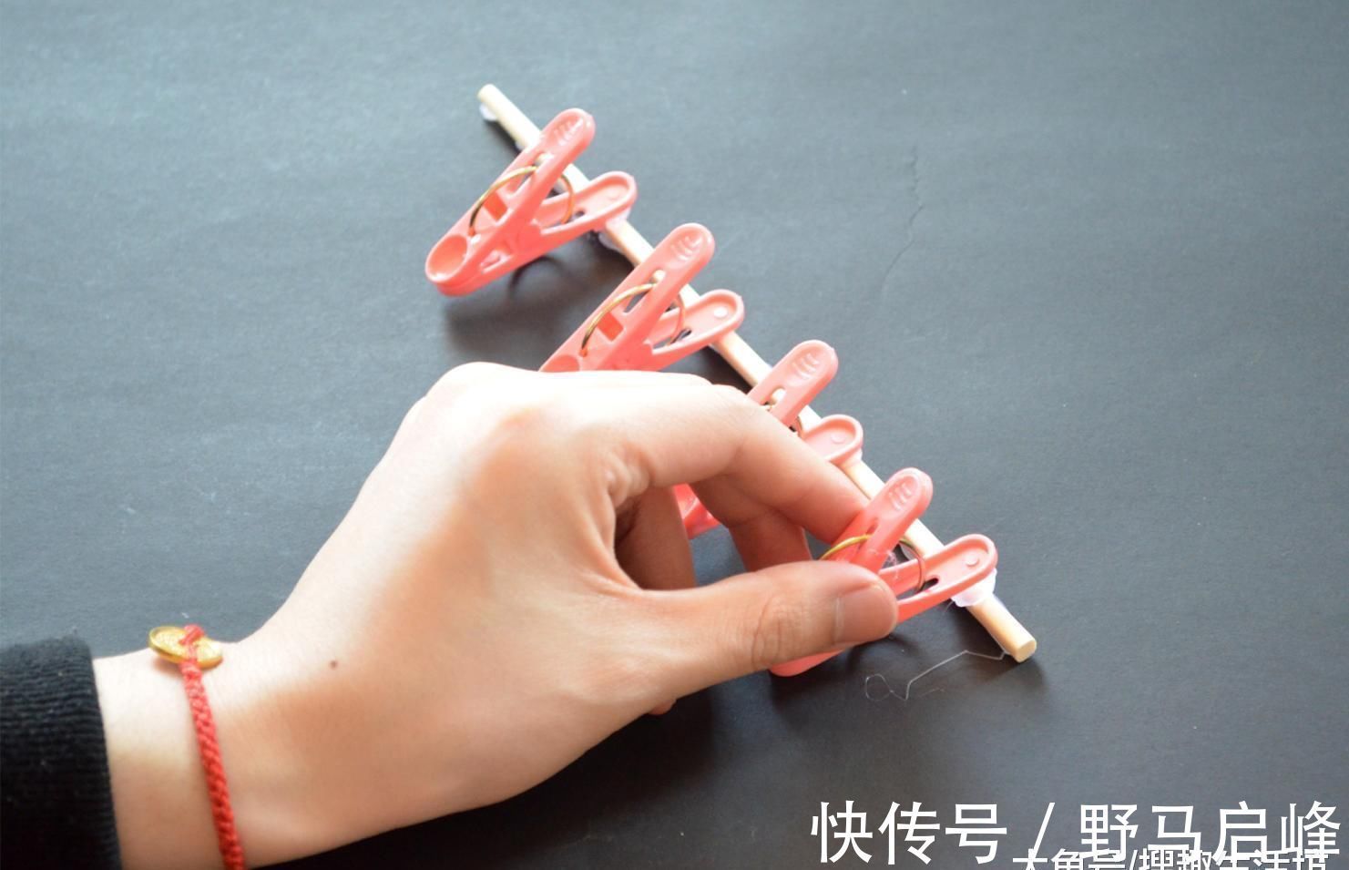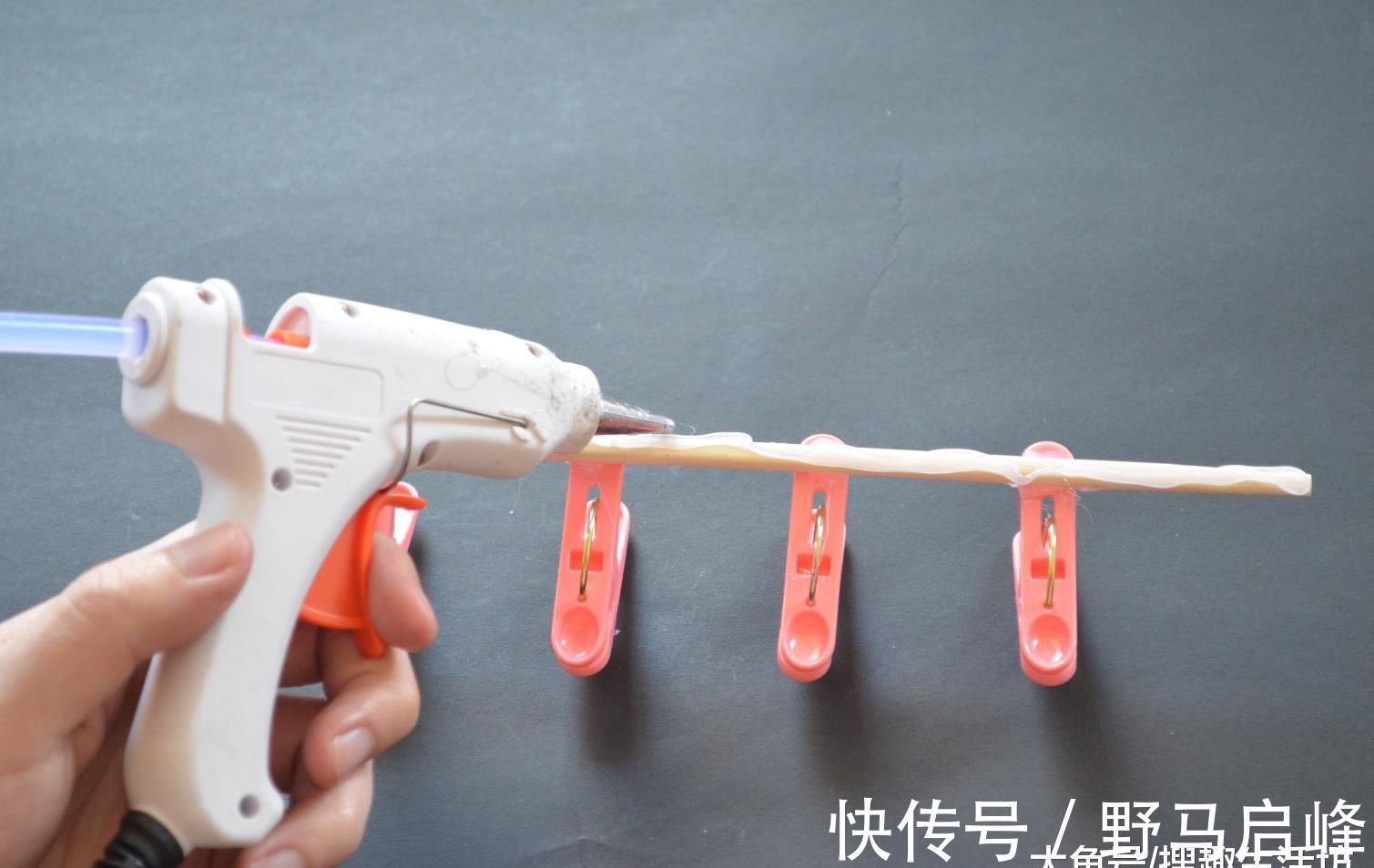 然后在塑料夹子的手柄上涂上热熔胶,并且把它粘在筷子上。每隔一小段距离,粘一个塑料夹子。